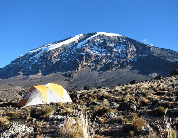 After breakfast, leave the glades of the rain forest and continue on an ascending path, crossing a little valley and walking along a steep rocky ridge covered with heather until the end of the ridge. The route then turns west onto a river gorge at 3658m (5-7 hours). Overnight at the Shira Campsite (3800 m)